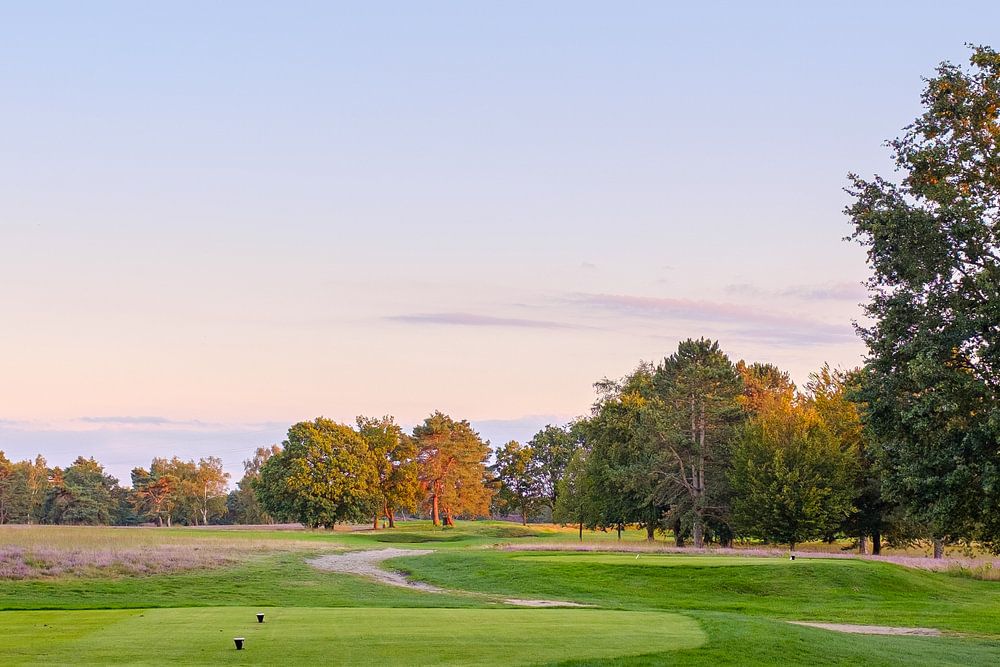 Ein Abschlag des Royal Golf Limburg, der teilweise im Naturschutzgebiet Ten Haagdoornheide in Houthalen-Helchteren, Belgien, in der Abenddämmerung liegt.