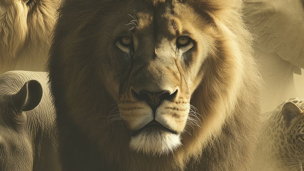Dieses beeindruckende, fotorealistische Gemälde zeigt eine majestätische Ansammlung afrikanischer Wildtiere, die aus einer aufgewirbelten Staubwolke aufzutauchen scheinen. In der Mitte ist ein imposanter Löwe mit einer vollen, königlichen Mähne zu sehen, dessen Blick kraftvoll und gelassen zugleich ist. Links brüllt ein zweiter Löwe mit weit aufgerissenem Maul, ein Ausdruck reiner Urkraft. Neben ihm steht ein massives Nashorn, dessen Haut voller Textur ist und dessen Horn sich scharf vom weichen, beigen Nebel abhebt. Auf der rechten Seite erhebt sich ein eleganter Elefant mit leicht gebogenem Rüssel, während ein anmutiger Leopard durch den Staub schleicht.