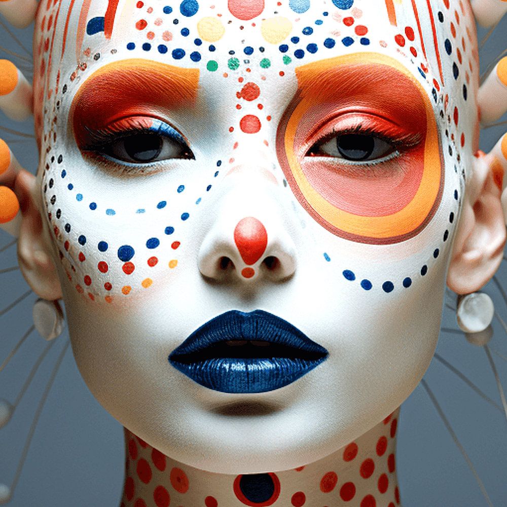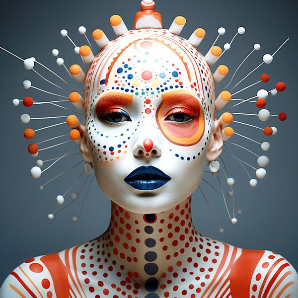 Dieses fesselnde Porträt präsentiert eine futuristische Symbiose aus Mensch und abstrakter Kunst. Auf einer makellos weißen Hautoberfläche entfaltet sich ein präzises Muster aus leuchtend orangefarbenen Punkten und Linien, die sowohl an digitale Strukturen als auch an traditionelle Ornamentik erinnern. Tiefblaue Lippen setzen einen…