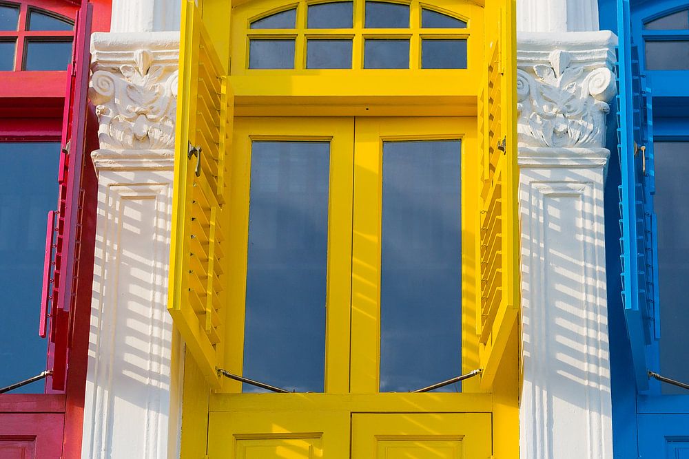 Kolonialtüren in Rot, Gelb und Blau und Verzierungen auf der Oberseite. Diesem Foto wurde eine alte Kolonialnachbarschaft in Singapur eingelassen.