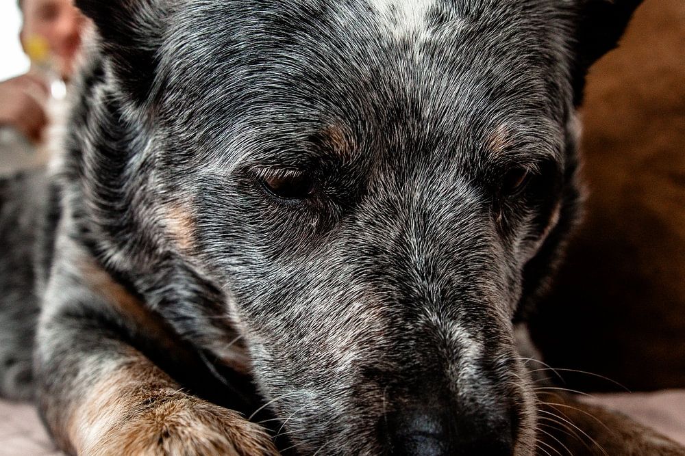 Diese lebhafte Farbfotografie zeigt einen erwachsenen Hund in einem ruhigen Moment, der sanft an einem Kauspielzeug knabbert. Der Hund hat ein auffallend gestromtes Fell, wobei die Schnauze des Hundes im Bild hervorgehoben wird, wodurch die Struktur und das Muster seines Fells hervorgehoben werden. Die Augen des Hundes sind teilweise geschlossen, was auf einen Zustand der Zufriedenheit hindeutet. Im weich fokussierten Hintergrund fügt eine menschliche Figur der Szene eine Ebene des alltäglichen Lebens hinzu und vermittelt ein Gefühl von Gesellschaft und Häuslichkeit.