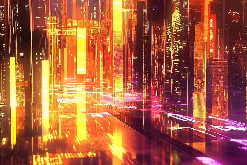 Das konzeptionelle Panorama einer Stadtsilhouette, beleuchtet vom Schein der Neonlichter und Elementen der digitalen Welt, fängt die Energie des städtischen Lebens ein.