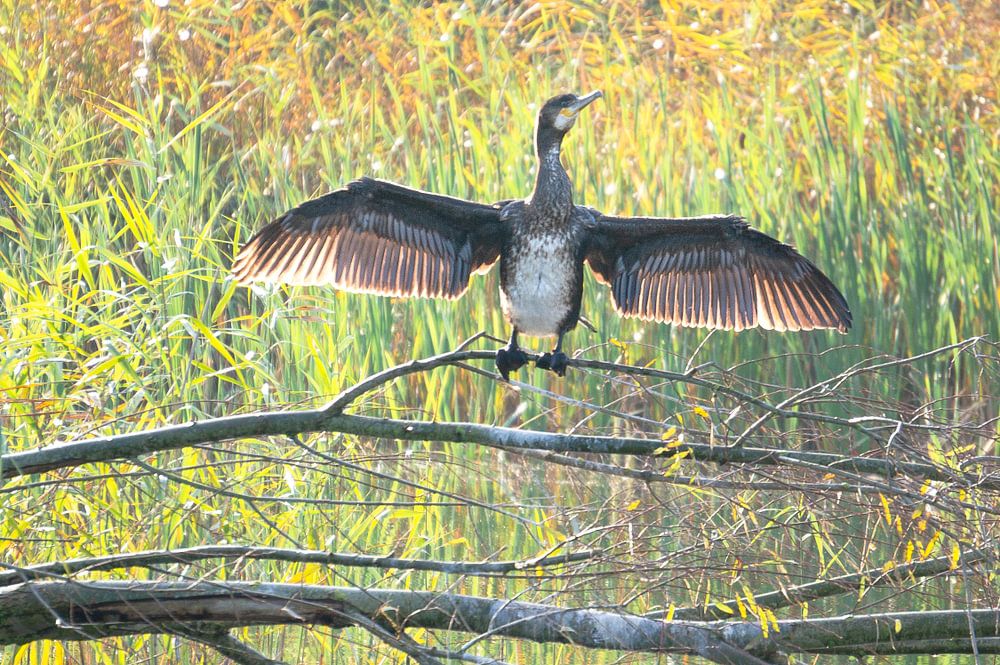 Kormoran im ersten Morgenlicht mit voll ausgebreiteten Flügeln. Auf einem Ast über dem Wasser mit der Reflexion im stillen Wasser. Mit den sanften Farben des Schilfs im Hintergrund.