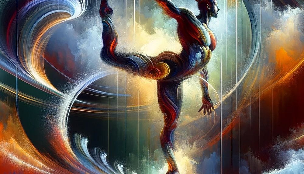 Auf diesem Bild ist eine Tänzerin abgebildet, die in einem virtuosen Solo eine Haltung einnimmt, welche an die Gravitation und Schönheit der Himmelskörper erinnert. Ihr Körper scheint sich mit einer überirdischen Anmut zu bewegen, während um sie herum ein kosmisches Ballett aus Strahlen und Sternenstaub stattfindet. Die Farben verschmelzen von satten Rottönen zu sanften Blau- und Weißtönen, die die Weite und das Mysterium des Weltraums suggerieren. Die Szene strahlt eine kraftvolle Ruhe aus und vermittelt das Gefühl, Zeuge eines unendlichen Tanzes zu sein, der über Zeit und Raum hinausgeht.