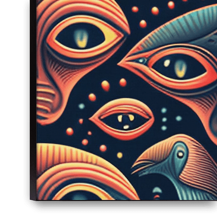Kosmische Visionen präsentiert einen faszinierenden Wandteppich aus fremden Gesichtern und symbolischen Augen, die in einer hypnotischen, fast heiligen Geometrie angeordnet sind. Das Bild ist symmetrisch und wiederholt sich in einer rhythmischen visuellen Kadenz, die an die Struktur eines Mandalas erinnert. Jede fremde Figur hat einen…