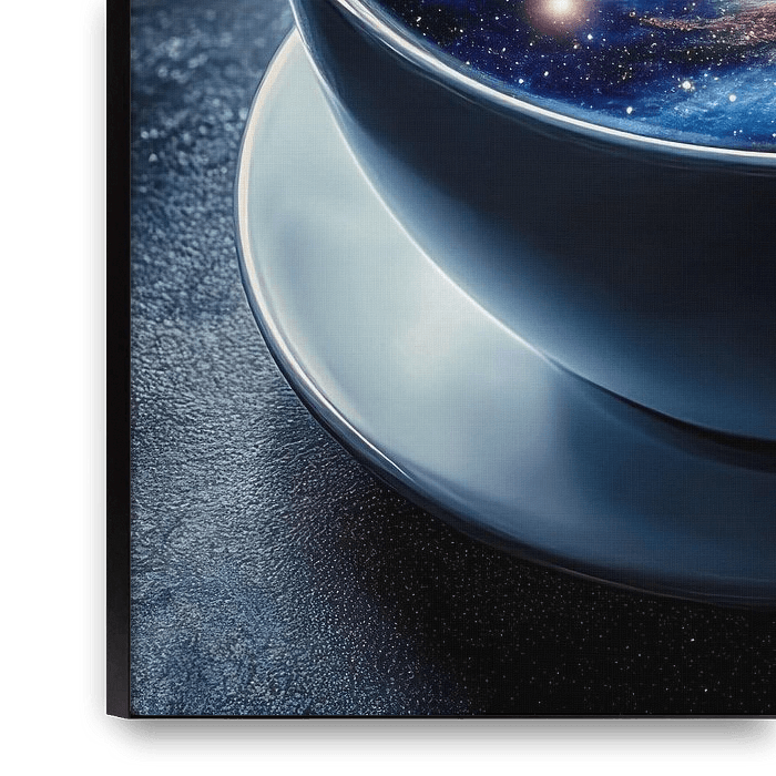 Dieses surreale und fesselnde Kunstwerk verbindet das Himmlische mit dem Alltäglichen und verwandelt eine gewöhnliche Tasse Cappuccino in ein hypnotisierendes kosmisches Wunder.