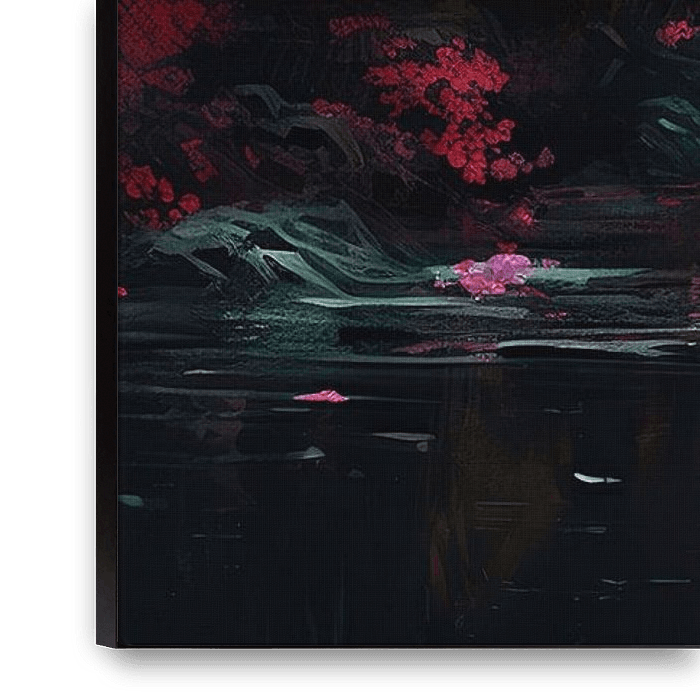 Kranichgemälde - Im Vordergrund steht ein anmutiger Kranich, der in ein Spiel aus Licht und Schatten getaucht ist. Eine magische Palette aus feuchten Erdfarben und leuchtenden Tönen erweckt das Gefieder zum Leben. Der Hintergrund bildet eine mystische Szene mit üppigen, karminroten Bäumen, die sich im ruhigen Wasser spiegeln und für…