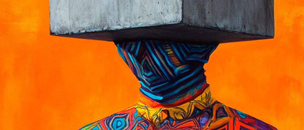 Ein faszinierendes Zusammenspiel von Farben und Formen, das ins Auge springt: Ein kunstvoll gekleidetes Wesen mit einem avantgardistischen Kopf aus Beton sticht hervor. Die kräftigen Orange- und Blautöne verleihen jedem Raum eine energiegeladene Atmosphäre. Perfekt für ein kreatives Büro oder ein modernes Wohnzimmer, wo Inspiration fließt und Gespräche lebhaft werden.