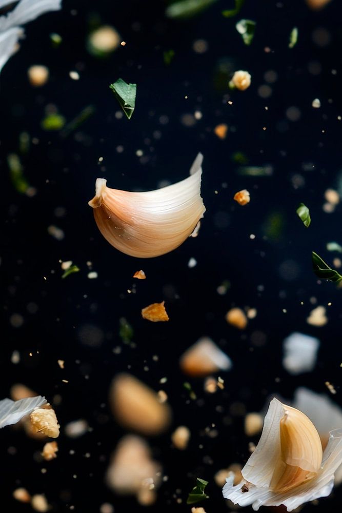 Diese dynamische Komposition fängt den Moment der Bewegung und Energie ein, während zarte Knoblauchzehen und Schalen durch die Luft wirbeln. Die kontrastreiche Darstellung und die spektakulären Details verleihen jedem Raum eine lebendige Note. Ideal für die Küche, wo Kreativität und Genuss zu Hause sind, inspiriert sie beim Kochen zu neuen kulinarischen Abenteuern.