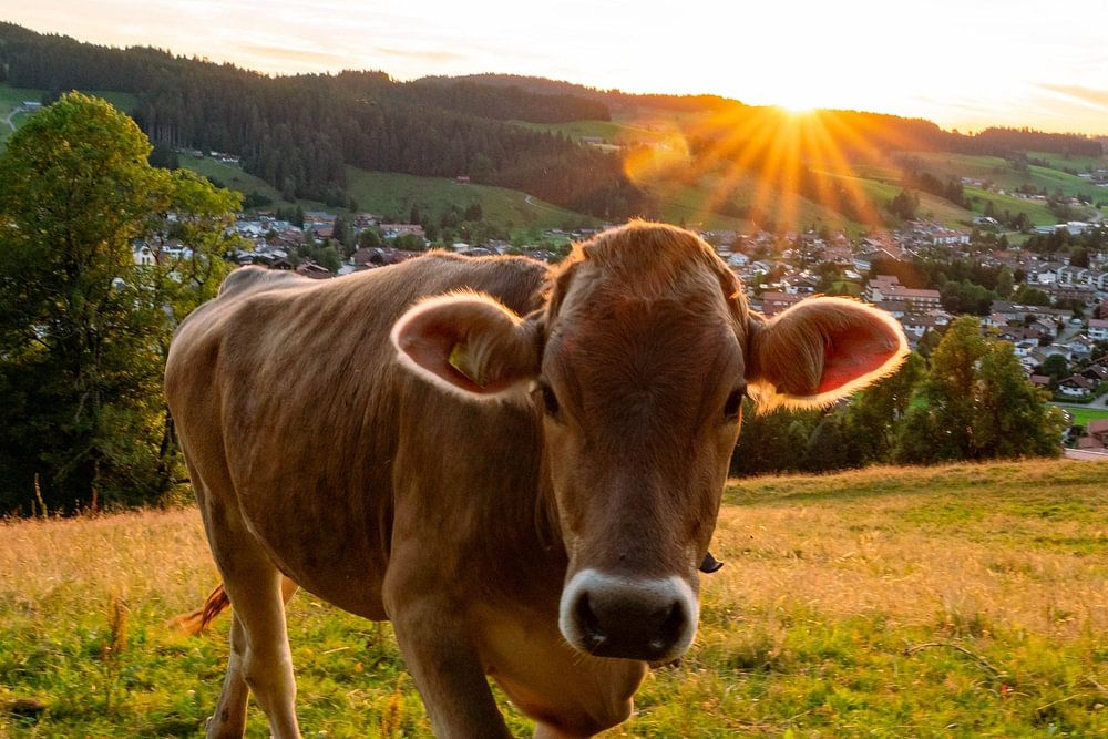 Kühe am Staufen mit Blick auf Oberstaufen zum Sonnenuntergang