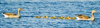 Dieses Gänsepaar genießt zusammen mit seinen fünf Küken ein schönes Bad im Bargerveen. Sie schwimmen zusammen in einer Reihe. Zusammen mit Papa und Mama Gans.