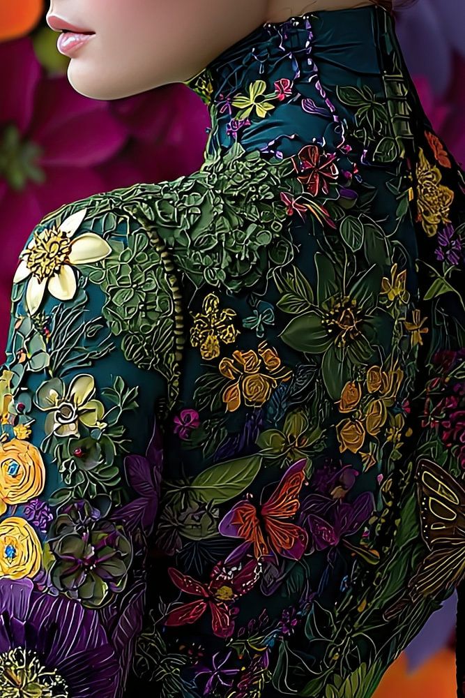 Kombination aus Malerei und/oder Fotografie eines fiktiven Modells mit Blumen- oder Fantasiehintergrund