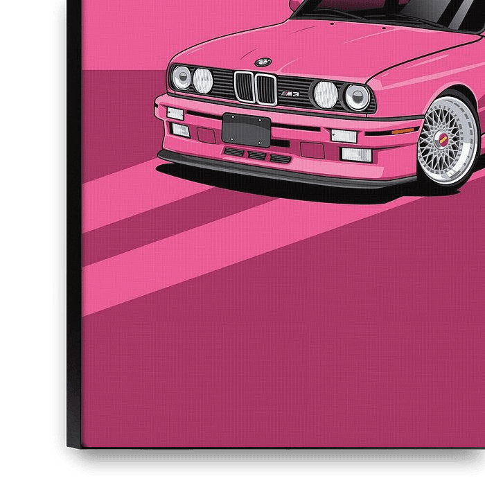 Bestelle dieses Popart-Wandbild Kunstauto BMW E30 M3 rosa von D.Crativeart als Reproduktion auf Leinwand, Alu-Dibond, als Poster, Fototapete oder Acrylglasbild.