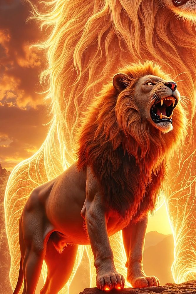 Auf schwarzem Gestein erhebt sich der Löwe, sein Blick fest, seine Mähne von Feuer durchdrungen. Hinter ihm lodert das übermächtige Abbild eines gigantischen Löwen aus reinem Licht, das den Himmel erhellt. Es ist ein Bild der Stärke, der Würde und der unendlichen Kraft, die in jedem von uns schlummert.
