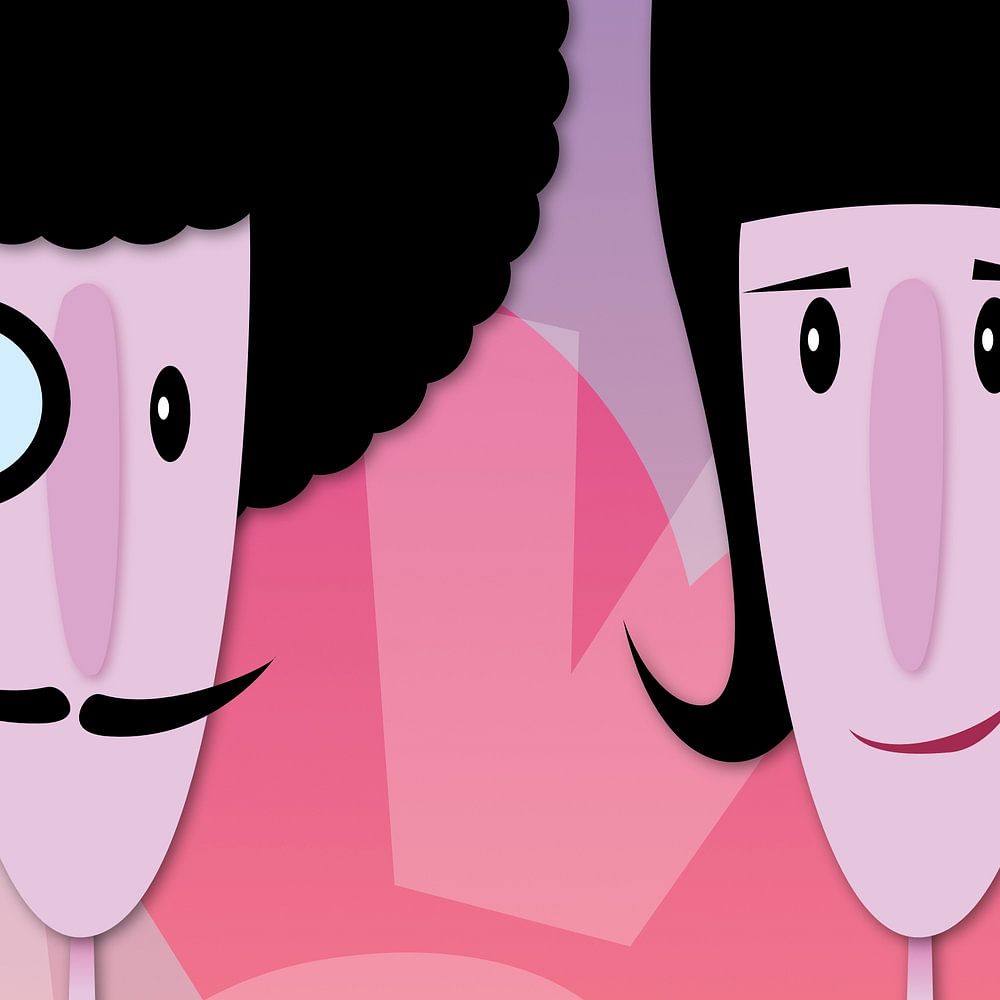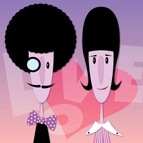 Eindeutig ein verliebtes Paar mit Humor, das gute Laune macht! Sie basieren auf einem Gemälde, das ich einmal gemalt habe (zum Glück hatte ich das Foto noch). Es hat mir viel Spaß gemacht, diese Version zu erstellen. Sie enthält viele grafische Elemente: Schwarz und Weiß, klare Linien und verzerrter Text.