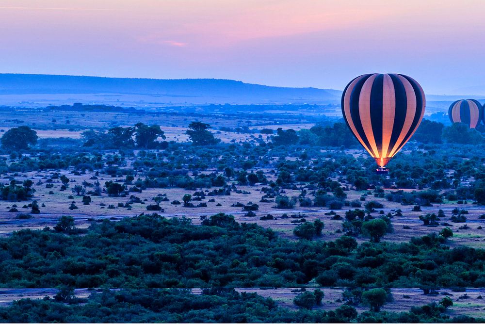 Heissluftballon, Himmel, blauer Himmel, farbiger Himmel, Landschaft, Natur, Afrika, Wolke, Wolken, Baum, Bäume, Landschaft, Reise, Ferienziel, Reiseziel, Reiseziel, Schönheit, blau, violett