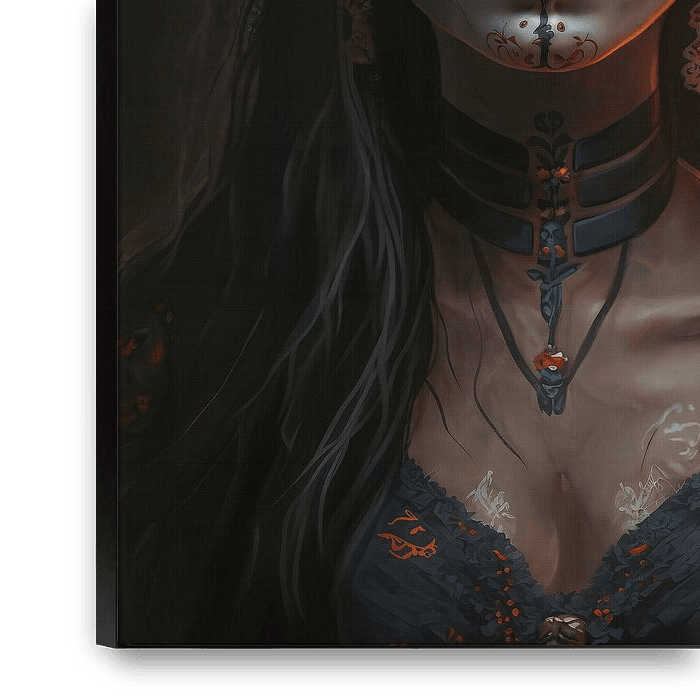 In diesem digitalen Frauenporträt blickt uns die elegante La Catrina direkt in die Augen, gehüllt in die Farben des Día de Muertos. Ihre Augen sind geheimnisvoll und ihr Gesichtsausdruck ist ruhig und selbstbewusst, trotz des dunklen Hintergrunds, der sie umgibt. In ihrem üppigen Haar befinden sich wunderschöne orangefarbene und rote…