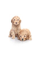 Dies ist ein Foto von 2 Labradoodle-Welpen auf einem weißen Hintergrund in einer Studioumgebung. Die Reflexion der Hunde ist auf dem Boden sichtbar.