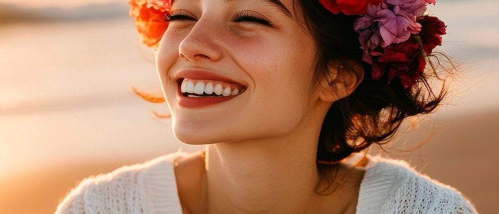 Mit einem strahlenden Lächeln und einer Krone aus bunten Blumen verkörpert diese Szene pure Lebensfreude und Unbeschwertheit. Die goldene Küstenstimmung und das sanfte Licht strahlen Wärme und positive Energie aus. Ideal für ein Wohnzimmer, das ein einladendes und fröhliches Ambiente schaffen soll.