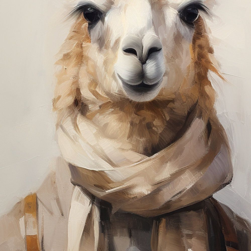 Lama Portrait Art | Lama mit Schal - Dieses zeitgenössische Portrait zeigt ein charmantes Lama, das mit einem Schal und einem Rucksack ausgestattet ist, als ob es bereit für ein Abenteuer wäre. Der Stil ist realistisch mit einem verspielten Twist, wobei hauptsächlich Erd- und Beigetöne vor einem neutralen Hintergrund verwendet werden, der es dem Motiv erlaubt, die ganze Aufmerksamkeit auf sich zu ziehen.