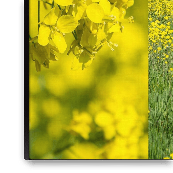 Im Frühjahr blühen Raps und Rübsen in einem frischen Gelb. Sie wird von Landwirten angebaut, aber die Blüten sind auch in der freien Natur als Unkraut verbreitet. In diesem Diptychon ist eine Nahaufnahme der gelben Blume mit einer Landschaft mit einem ländlichen Haus verschmolzen. Die grünen Bäume und Blumenwiesen bilden eine…