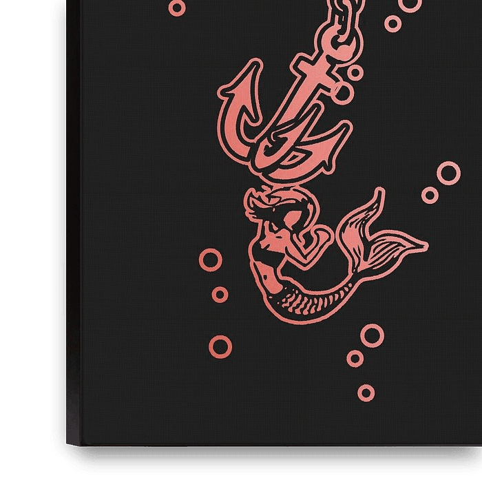 Die obere Meerjungfrau sitzt auf einem Herz, an dem eine Kette und ein Anker hängen. Die untere Meerjungfrau hängt an dem Anker.