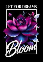 Ein lebhaftes und fesselndes digitales Kunstwerk mit einer stilisierten Lotusblume in tiefen Violett-, Magenta- und Blautönen vor einem tiefschwarzen Hintergrund. Die Blume steht in voller Blüte, umgeben von abstrakten Blättern und Blütenblättern in Komplementärfarben. Der inspirierende Text "LET YOUR DREAMS" erscheint oben,…