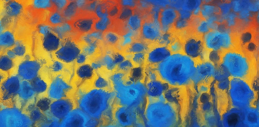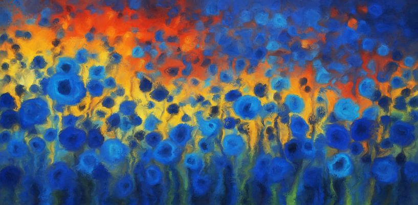 Kräftige blaue Blumen heben sich von einem feurigen gelben und orangefarbenen Hintergrund ab und rufen einen Kontrast zwischen kühlen und warmen Farben hervor. Die wirbelnden Muster innerhalb der Blumen und der impressionistische Stil verleihen der Szene eine traumhafte Qualität.