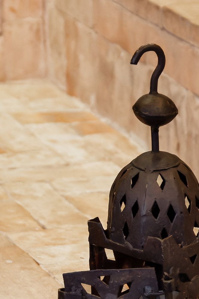 Eine Detailaufnahme einer kleinen arabischen Metalllaterne auf einer Alabastertreppe.