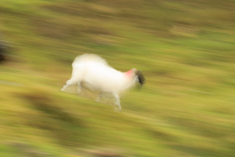 Schafe laufen auf den Hügeln des Healy-Passes. Die Bewegung der Kamera erzeugt einen malerischen Effekt.