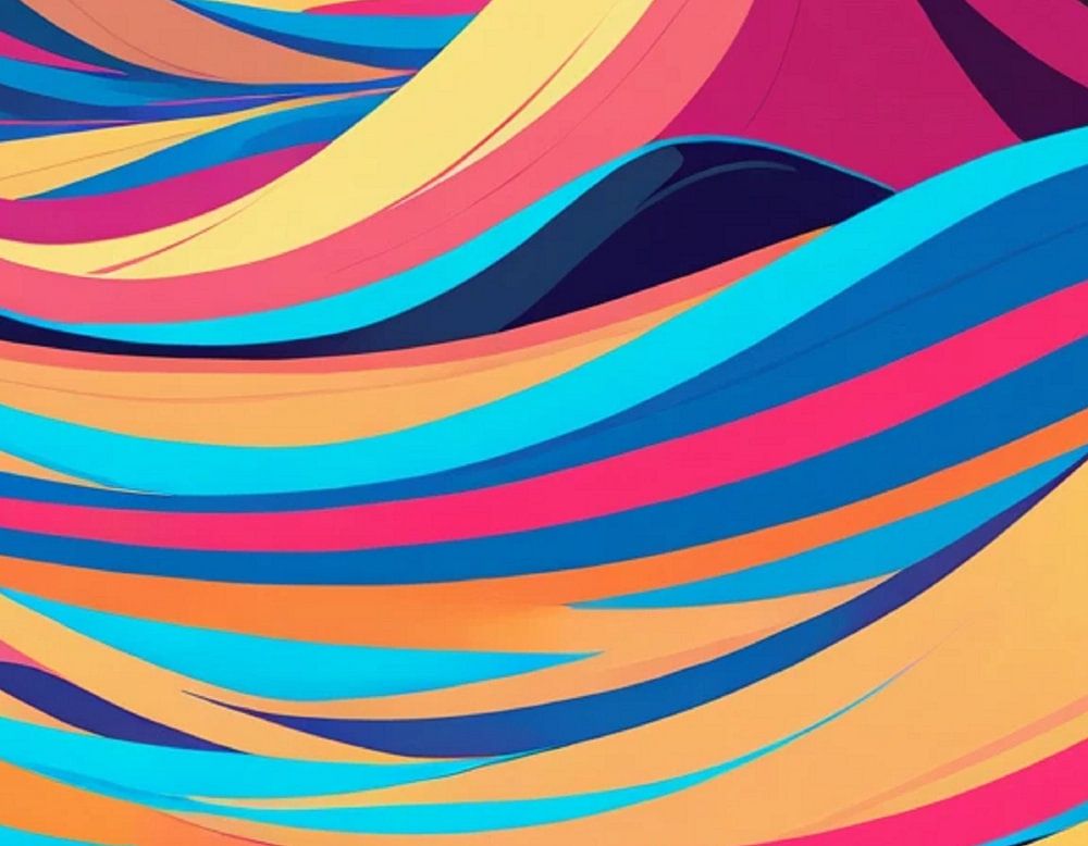 Dieses Kunstwerk zeigt eine surreale und fesselnde Berglandschaft, die mit kühnen, wogenden Farbwellen dargestellt ist. Der Vordergrund wird von fließenden, gestreiften Mustern in Blau-, Rosa-, Orange- und Gelbtönen dominiert, die ein dynamisches Gefühl der Bewegung erzeugen. Im Hintergrund spiegeln stilisierte Berge diese leuchtenden Farben unter einem klaren Himmel mit einer auffälligen goldenen Sonne wider. Ein kleines Büschel gelber und blauer Blumen in der unteren rechten Ecke fügt dieser ansonsten abstrakten und energiegeladenen Szene ein zartes natürliches Element hinzu. Der Gesamteindruck ist der einer fröhlichen Fantasie und einer spielerischen Interpretation der Formen der Natur.