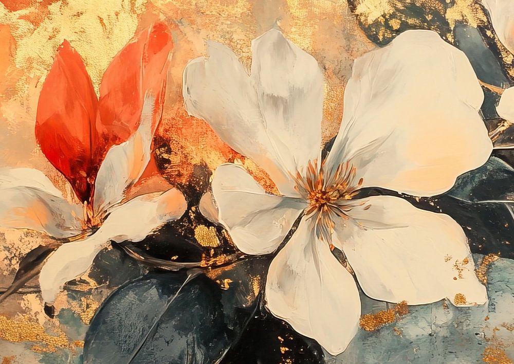 Details: Blumenbild, moderne Kunst, Blumenkunst, goldene Textur, rostiger Hintergrund, lebendige Blumen, rote Blume, weiße Blume, dunkelgrüne Blätter, luxuriöses Gefühl