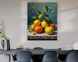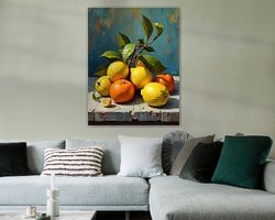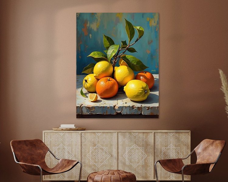 Ein helles und detailliertes Stillleben mit einer Gruppe von Zitronen und Orangen mit üppigen grünen Blättern, die auf einer strukturierten Oberfläche vor einem leuchtend blauen und grünen Hintergrund angeordnet sind. Das Sonnenlicht hebt die reichen Texturen und Farben der Früchte und Blätter hervor.