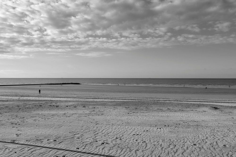 Wolken, die sich am Horizont ausbreiten und in Kombination mit Schattenlinien am Strand ein Gefühl von freiem Raum erzeugen.