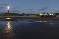 Texel, Cocksdorp - Der Texeler Leuchtturm und der schön beleuchtete Strandpavillon Faro2. Das Foto wurde vom Strand aus aufgenommen, mit dem Meer im Hintergrund.