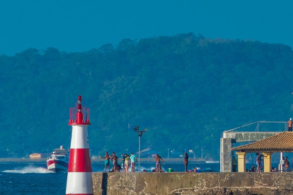 Leuchtturm von Humaita Point, wo sich Menschen zum Fischen versammeln und vor allem den schönen Sonnenuntergang genießen. Salvador, Bahia, Brasilien