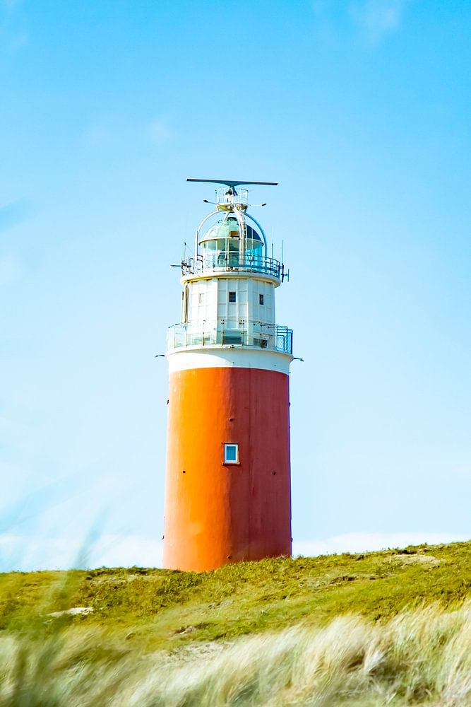 Durch die Dünen mit Blick auf den Leuchtturm an einem schönen Sommertag mit blauem Himmel.