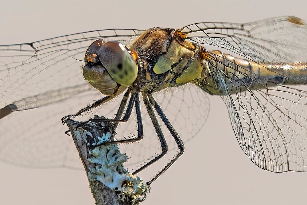 Die Heidelibelle ruht sich am Ende eines heißen Tages aus.