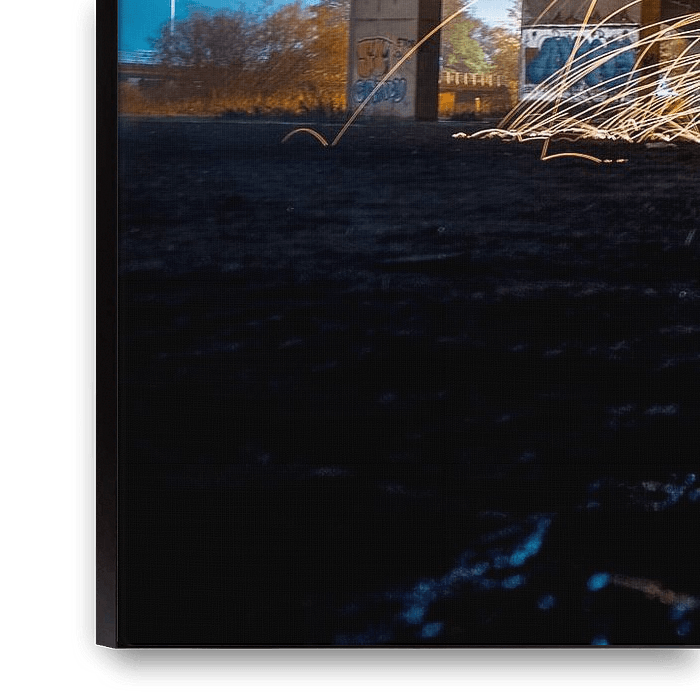 Bestelle dieses abstrakte Wandbild Lichtmalerei mit Feuerfunken unter dem Viadukt von Fotografiecor .nl als Reproduktion auf Leinwand, Alu-Dibond, als Poster, Fototapete oder Acrylglasbild.