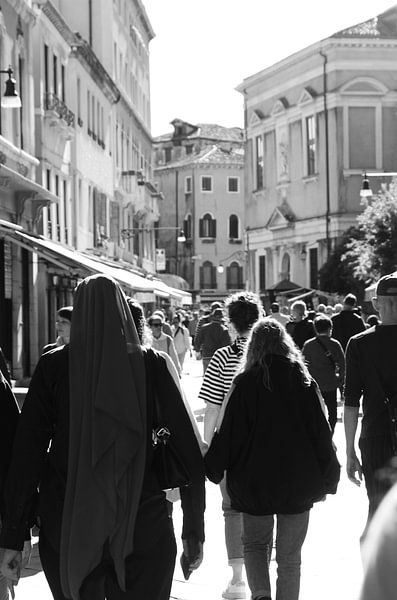 Dieses Werk fängt die unverkennbare Energie eines sommerlichen Nachmittags in den Gassen Venedigs ein. Die Fotografie nutzt das intensive Gegenlicht, um die Passanten im Vordergrund in dunkle Silhouetten zu verwandeln. Der Blick folgt dem Strom der Menschen hinein in die Tiefe der überfüllten Gasse, wo das Licht zwischen den…