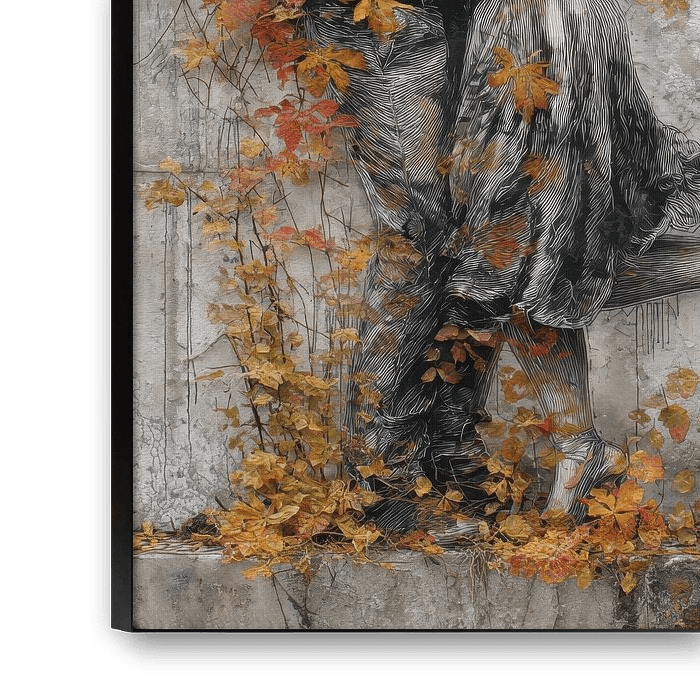 Dieses urbane Streetart-Gemälde eines tanzenden Paares vor einer verwitterten Wand mit roten und goldenen Herbstblättern wirkt verträumt und romantisch und verleiht Ihrer Einrichtung Charakter. Es strahlt Wärme, Verbundenheit und Zärtlichkeit aus und bringt eine poetische Atmosphäre in den Raum.