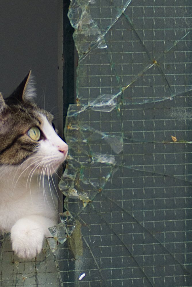 eine Katze, die aus einem zerbrochenen Fenster in Lissabon schaut. Die Katze sah ein Vogelhaus und blieb einige Minuten lang sitzen, so dass ich genug Zeit hatte, das Foto zu machen.