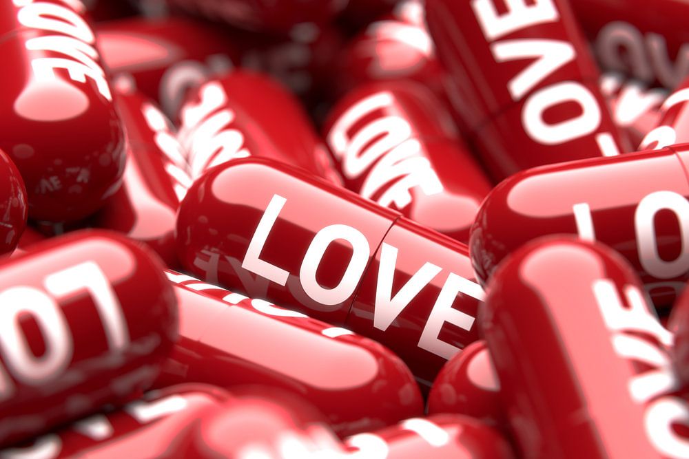 Rote medizinische Kapseln mit dem Aufdruck "LOVE". Liebe als Medikament!