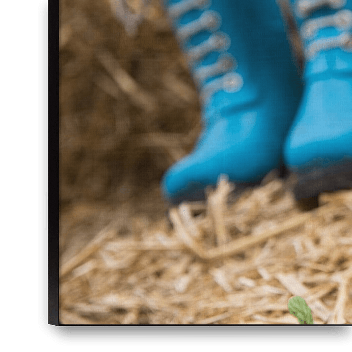 Bestelle dieses Blumen-Wandbild Lief geel bolletje bloemen mannetje met blauwe kaplaarzen op een hooiberg von Dexter Reijsmeijer als Reproduktion auf Leinwand, Alu-Dibond, als Poster, Fototapete oder Acrylglasbild.