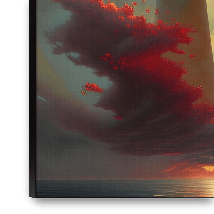 Digital artwork like a painting, a lighthouse is floating on top of a red sunset cloud, the light of the the beacon seems to merge with the remaining sunshine while surrounded by an ornate cloudscape. Digital painting by Christine aka stine1 with the help of Artificial Intelligence.