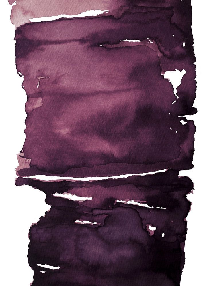 Dieses Bild zeigt eine abstrakte Aquarellmalerei in verschiedenen Schattierungen von tiefem Violett und Pflaume. Die Pinselstriche bilden eine annähernd rechteckige vertikale Form mit unregelmäßigen Rändern und horizontalen weißen Streifen, die durchscheinen und dem Bild ein mehrschichtiges und strukturiertes Aussehen verleihen. Die Farben gehen von einem helleren, staubigen Mauve im oberen Bereich zu einem satten, fast schwarzen Violett im unteren Bereich über. Der organische Fluss des Aquarells schafft ein Gefühl von Tiefe und Bewegung und erzeugt eine stimmungsvolle, atmosphärische Qualität.