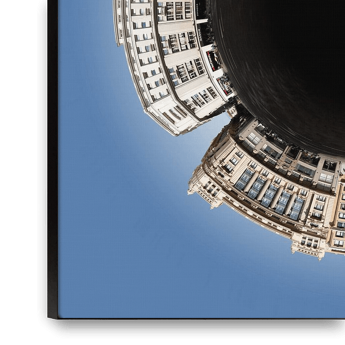 Die Gran Via, Madrids Prachtboulevard, als Miniplanet Projektion. Das Original Panorama (Fotograf: Victor Lavilla) können Sie hier bestaunen: http://panoramastreetline.de/gran-via-madrid-spanien-P858