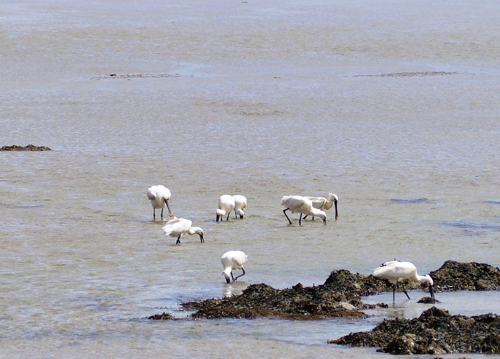 Löffler fliegen und suchen im Wattenmeer von Terschelling unter dem Deich nach Nahrung.