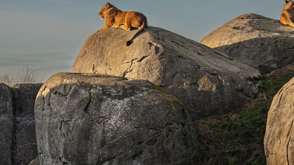 Bei schönstem Sonnenschein liegen sie auf ihrem Felsen im Wildlife Park Wildlands in Emmen in ihrem schönen und großen Gehege