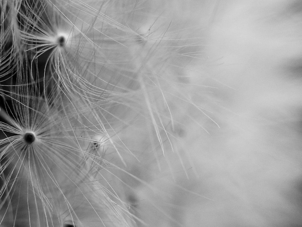 Schönes, mysteriöses Schwarz-Weiß-Makrofoto eines Löwenzahnes in den belgischen Ardennen, aufgenommen, bevor die Samen durch den Wind verteilt werden. Wenn du diese Samen selbst aus dem Stiel bläst, kannst du dir einen Wunsch machen ;-)